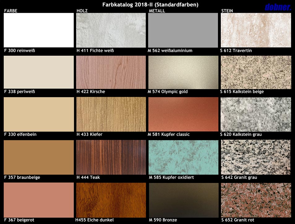 Als Sonderfarben für das EURACON Fassadensystem FS-300 ist das gesamte Spektrum an RAL-Farben möglich. Auch spezielle Muster Ihrer Wahl können als Sonderanfertigung für die DOBNER Fassade FS-300 geliefert werden. Die metallischen Oberflächen für Fassadensystem  werden im Galvanisierungsverfahren hergestellt.